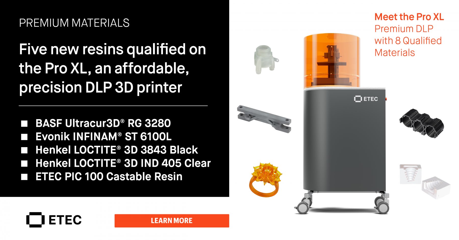 ETEC Pro-XL est l'imprimante 3D de bureau de qualité professionnelle la plus avancée de notre gamme. En plus d'avoir la vitesse la plus rapide pour une imprimante DLP de bureau, la Pro XL d'EnvisionTEC (ETEC - Groupe DM) fournit des pièces extrêmement précises avec les détails les plus fins disponibles en impression 3D DLP. La Pro XL est compatible avec la majorité des résines du marché, y compris les plus techniques.